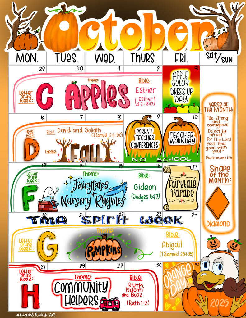 Download the monthly preschool calendar to stay up-to-date with themes, Bible verses, and important information you might need for the current month.